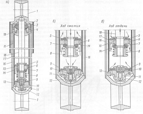 Во время хода сжатия рессоры поршень амортизатора движется вниз, перепускной клапан открывается и жидкость перетекает через отверстия поршня в надпоршневое пространство. Под давлением жидкости клапан сжатия преодолевает усилие пружины и открывается, при этом жидкость в объеме, равном вводимой части штока, вытесняется из рабочего цилиндра в резервуар. Усилие пружины клапана сжатия создает необходимое сопротивление амортизатора, в результате чего частота колебаний подвески и подрессоренных масс автомобиля уменьшается. При перемещениях штока жидкость, частично просачиваясь через зазор между направляющей втулкой и штоком, поступает через отверстие в полость резервуара, разгружая тем самым сальники от действия рабочего давления жидкости.