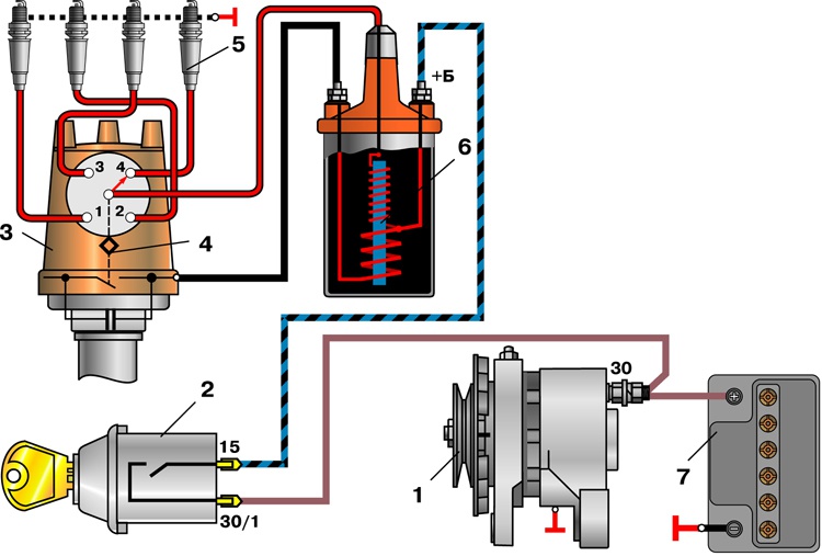 2. зажигания; 3,4трамплер; 5.свечи; 6.катушка; 7.Аккомулятор.