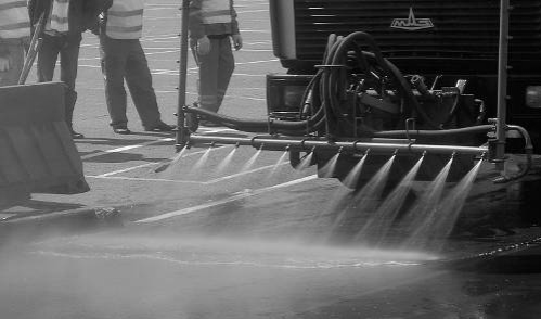 Машина с высоконапорной системой, которая обеспечивает лучшую мойку дорожного покрытия, обслуживает полосу, прилегающую к лотковой части, где скапливается больше загрязнений. Машины с щелевыми насадками моют остальную часть городской дороги.