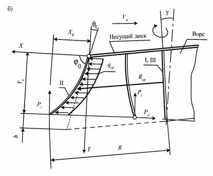 , которая в положении II направлена перпендикулярно плоскости чертежа. Действием силы трения в радиальной плоскости можно пренебречь, что приводит к завышению расчетного значения вертикальной реакции Pt. Однако если при определении силы Pt одновременно пренебречь тангенциальным изгибом прутка ворса, который увеличивает силу Pt, то погрешности от двух этих допущений взаимно компенсируются. При дальнейшем повороте конической щетки деформация ворса в вертикальном направлении и его изгибная деформация уменьшаются и в положении III, диаметрально противоположном положению I, имеем h = 0. Поскольку деформация ворса в процессе вращения щетки изменяется непрерывно от нуля до максимума и вновь до нуля, а не скачкообразно, как у цилиндрической щетки, то рациональным является расчет отброса смета в горизонтальном направлении только под действием радиальных и тангенциальных сил инерции.