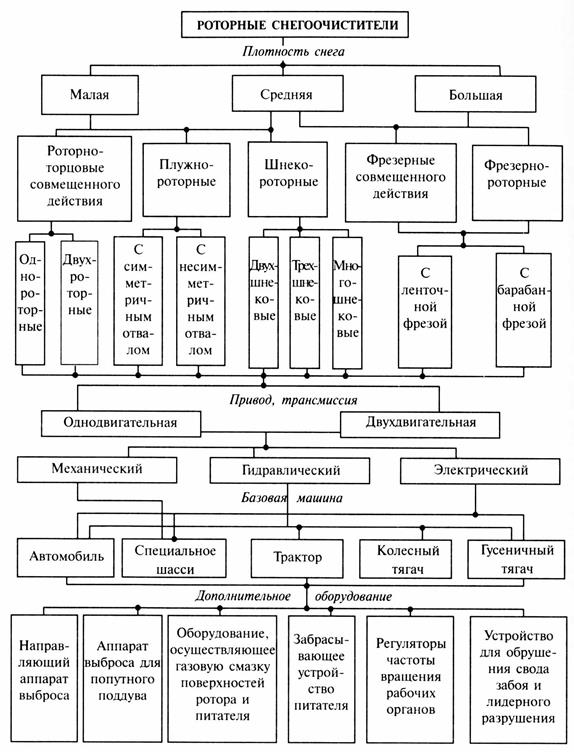 Классификация роторных снегоочистителей приведена на рис. 1. При разработке снега малой плотности применяют плужно-роторные снегоочистители с роторно-лопастным метателем, расположенным соосно направлению движения машины, и одним несимметричным относительно продольной оси машины или двумя симметричными отвалами. Такую же область применения имеют роторно-торцовые снегоочистители совмещенного действия, которые разрабатывают снежные забои непосредственно торцами лопастных роторов, выбрасывающих затем снег в сторону от направления движения машины. Роторно-торцовые снегоочистители бывают однороторные, обычно монтируемые на малогабаритных шасси для уборки тротуаров, и двухроторные, у которых оси вращения лопастных роторов параллельны оси движения машины.