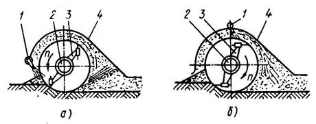 Роторы дорожных фрез могут обрабатывать грунт в направлении сверху вниз (рис. 58, а), т. е. осуществлять резание, начиная от дневной поверхности грунта, или снизу вверх (рис. 58, б) от нижней части грунтового слоя к дневной поверхности.
