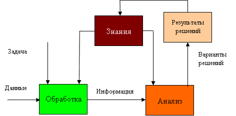 Для решения поставленной задачи фиксированные данные обрабатываются на основании имеющихся знаний, далее полученная информация анализируется с помощью имеющихся знаний. На основании анализа, предлагаются все допустимые решения, а в результате выбора принимается одно наилучшее в некотором смысле решение. Результаты решения пополняют знания.