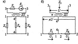 В частности, если рассматривается прохождение сигнала от источника, подключенного к диагонали 4-4, то внешнее сопротивление Z3 удобно принять равным нулю. К точкам 4,4 (Рис. 1.52 а)подключим генератор с внутренним сопротивлением Zг, к точкам 1,1 - линию с волновым сопротивлением Z1 а к точкам 2,2 - балансное сопротивление ZбПо отношению к точкам 4,4 они включены параллельно, и к ним приложено напряжение U4, так как при Z3 = 0 сопротивления обмоток W"1 ,W'1 также будут равны нулю. Результирующий магнитный поток, пронизывающий витки вторичной обмотки ДТ, в случае баланса равен нулю - это следует из условия