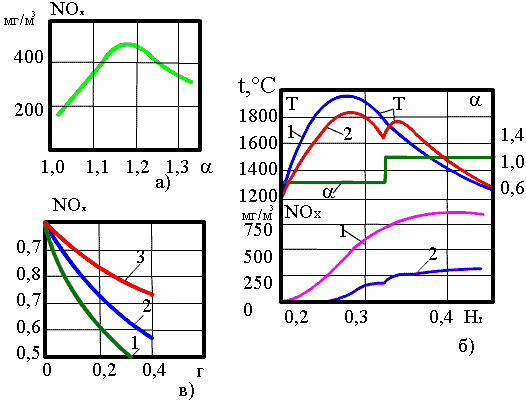 Рис. 7.26. Зависимость образования оксидов азота от определяющих параметров: а - от избытка воздуха в зоне горения; б - при двухступенчатом сжигании: 1 - одноступенчатое сжигание; 2 - двухступенчатое сжигание; α - избыток воздуха в зоне горения; в - от рециркуляции газов: 1 - при смешении газов с горячим воздухом перед горелкой; 2 - при вводе газов в каналы горелки; 3 - при вводе газов соплами под горелки.