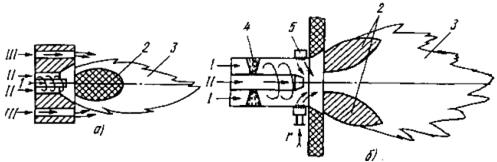 Рис. 7.27. Горелки двухступенчатого сжигания: а - для твердого топлива; б - для природного газа; 1 - ввод аэропыли; 2 - зона горения с α < 1; 3 - зона дожигания; 4 - завихривающие лопатки; 5 - газовая кольцевая камера; I, II, III - соответственно подача первичного, вторичного и третичного воздуха