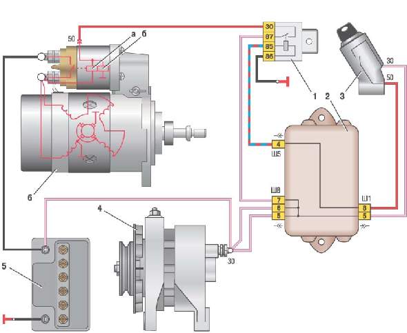 После пуска двигателя срабатывает муфта свободного хода, шестерня выводится из зацепления, а при установке ключа в положение «Зажигание» обесточивается реле К1, и размыкаются контакты К1.1.