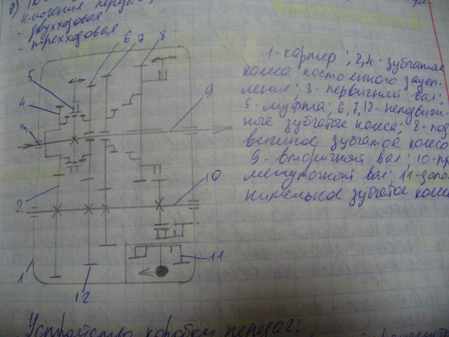 Устройство: первичный вал подшипника, зубчатые колёса постоянно зацепленные, синхронизаторы четвёртой и пятой передач, зубчатые колёса четвёртой передачи, зубчатые колёса третьей передачи,синхронизаторы второй и третьей передачи, зубчатые колёса второй передачи,, подвижное зубчатое колесо первой передачи и заднего хода, уплотнительные манжеты, вторичный вал, зубчатое колесо первой передачи, зубчатое колесо заднего хода промежуточного вала, промежуточный вал, блок зубчатых колёс заднего хода, распорная втулка.