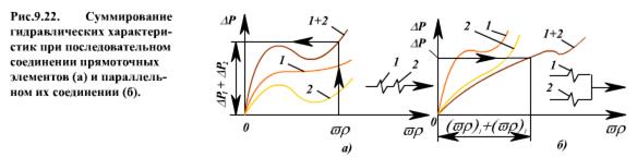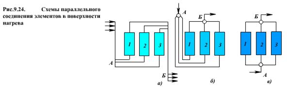 В предыдущих разделах рассматривалась гидравлическая характеристика одиночной трубы. Элементы парового котла (поверхности нагрева, соединительные трубопроводы) выполняются из ряда параллельно включенных труб, а сами элементы могут быть соединены как параллельно, так и последовательно. В зависимости от схемы соединения суммирование гидравлических характеристик отдельных труб производится различными способами. При последовательном включении труб или элементов суммирование производится при одинаковых расходах среды (рис.9.22а): сопротивление двух или более последовательно включенных труб равно сумме их сопротивлений (Δр = ΣΔpi при G = const). При параллельном соединении труб или элементов (рис.9.22а) перепад давления на них одинаков, но расход равен сумме расходов по отдельным трубам (G = ΣGi, при Δр = const).