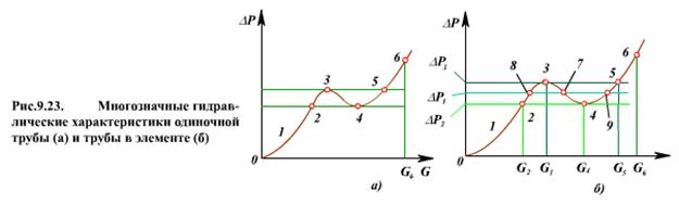 Сравним режим работы одиночной трубы и трубы в элементе (системе труб), имеющих многозначные гидравлические характеристики (рис.9.23). В одиночной трубе расход среды может изменяться за счет производительности насоса непрерывно от нуля до G6, перепад давления на трубе будет изменяться в соответствии с характеристикой 0 - 1 - 2 - 3 - 4 - 5 - 6 (рис.9.23а).