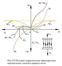 Графики получаются аналогичными, но повернутыми на 180° относительно центра осей. Еще одна особенность построения графиков при G < 0: рабочая среда поступает в трубы с опускным движением из верхнего коллектора, где ее энтальпия выше, чем на входе в панель. Энтальпия на входе трубы с опускным движением hОПВХ близка к энтальпии на выходе из всего элемента (hОПВХ ≈ hВЫХ). Следовательно, удельный объем в такой опускной трубе будет больше (ΔpГ больше), а плотность среды - меньше (ΔpНИВ меньше), чем в подъемных трубах.