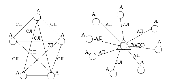 | А – абонентский пункт сети; СЛ – соединительная линия; | А – абонентский пункт сети; АЛ – абонентская линия; С – узловой пункт сети |