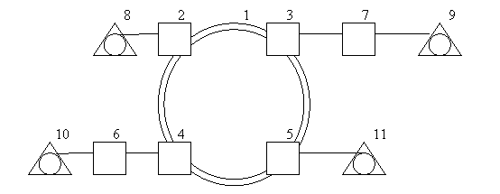 1 – оптоволоконное кольцо; 2,3,4,5 – мультиплексоры ввода-вывода; 6,7 – устройства сопряжения; 8,11 – цифровые АТС; 9,10 – АТС аналогового типа