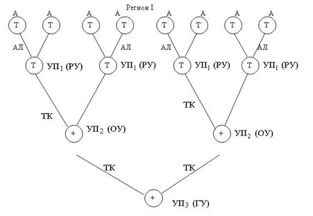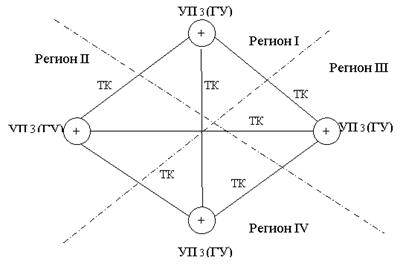 Принципы построения телеграфных сетей иллюстрируются рисунками 34, 35, на которых представлены функциональные схемы телеграфных сетей нескольких регионов и одного региона.