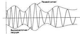 Для разделения абонентских каналов характерна техника модуляции высокочастотного несущего синусоидального сигнала низкочастотным речевым сигналом (рис. 41). Эта техника подобна технике аналоговой модуляции при передаче дискретных сигналов модемами, только вместо дискретного исходного сигнала используются непрерывные сигналы, порождаемые звуковыми колебаниями. В результате спектр модулированного сигнала переносится в другой диапазон, который симметрично располагается относительно несущей частоты и имеет ширину, приблизительно совпадающую с шириной модулирующего сигнала.