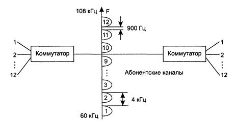 Принцип коммутации на основе разделения частот остается неизменным и в сетях другого вида, меняются только границы полос, выделяемых отдельному абонентскому каналу, а также количество низкоскоростных каналов в уплотненном высокоскоростном.