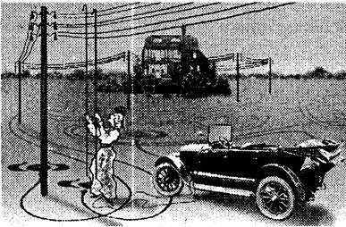 Последнее тому доказательство — мобильная телефония. Первый мобильный телефон был изобретен еще в 1910 году Ларсом Магнусом Эрикссоном (LarsMagnusEricsson). Этот телефон предназначался для автомобиля и был беспроводным только во время движения. Однако в движении им нельзя было пользоваться, для разговора нужно было остановиться, выйти из автомобиля и с помощью длинных жердей присоединить телефон к придорожным телефонным проводам (рис. 48). Понятно, что определенные неудобства и ограниченная мобильность воспрепятствовали коммерческому успеху этого вида телефонии.