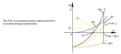 Расчет сложного контура циркуляции ведется почти так же, как в предыдущем случае. Отличие заключается в том, что определяется полезный напор контура SПОЛ КОНТ как сумма полезных напоров экрана (испарительных труб) SПОЛ ЭКР и отводящих труб SПОЛОТВ. Движущий напор отводящих труб SДВОТВ невелик, так как мала высота HОТВ, а сопротивление этих труб Δр*ОТВ значительно из - за большой скорости пароводяной смеси и дополнительного сопротивления ΔрВ.У. Поэтому SПОЛОТВ значительно меньше SПОЛЭКР и может быть отрицательным при GЦ > GК, (рис.9.45а).