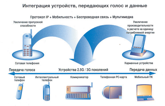 Необходимо отметить, что по мере внедрения сетей поколения 2,5G-3G происходит интеграция устройств, передающих голос и данные. Персональные коммуникаторы интегрируют в себе возможности сотового телефона и мобильного ПК (рис. 3).