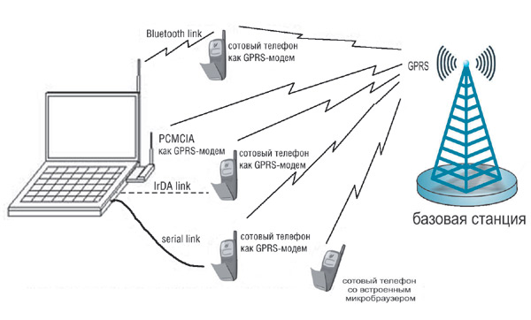Существуют два способа применения технологии GPRS для доступа к Интернету (рис. 64). При одном из них GPRS-устройство выполняет функции модема, с помощью которого пользователь портативного компьютера может просматривать Web-страницы HTML. При этом может использоваться как кабельное соединение телефона с ПК, так и беспроводное — инфракрасный порт или Bluetoth. Другой способ — это подключение к Интернету напрямую с мобильного устройства, поддерживающего технологию GPRS, что дает возможность просматривать Web-страницы в формате WAP при помощи встроенного микробраузера. Информация в формате WAP представляется в облегченном виде, поэтому для ее передачи требуется гораздо меньшая пропускная способность.