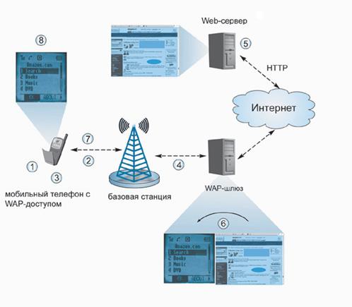 После того как информация получена WAP-клиентом, она отправляется на мини-браузер, который предлагает базовые средства навигации, и на дисплее мобильного устройства отображается версия Web-странички с упрощенной графикой (пункт 8).