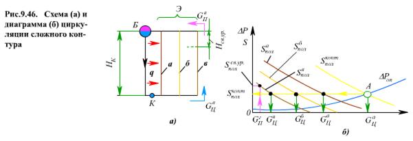 Построим диаграмму циркуляции простого варианта сложного контура (рис.9.46а), состоящего из опускных труб и трех рядов подъемных труб, введенных непосредственно в барабан выше уровня воды. Ряды труб имеют разную интенсивность обогрева: ряд б - средний тепловой поток qБ = qСР, ряд а - сильнообогреваемый (qа > qСР ), ряд в - слабообогреваемый (qВ < qСР).