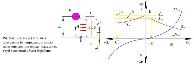 Рассмотрим контур циркуляции, в котором подъемные трубы введены в водяной объем барабана (рис.9.47а).