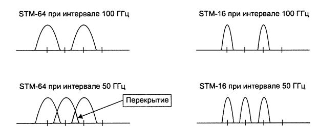 Реализация частотных планов с шагом 50 ГГц и 25 ГГц предъявляет гораздо более жесткие требования к оборудованию DWDM, особенно в том случае, если каждая волна переносит сигналы со скоростью модуляции 10 Гбит/с и выше (STM-64, 10GE или STM-256). Еще раз подчеркнем, что сама технология DWDM (как и WDM) не занимается непосредственно кодированием переносимой на каждой волне информации — это проблема более высокоуровневой технологии, которая пользуется предоставленной ей волной по своему усмотрению и может передавать на этой волне как дискретную, так и аналоговую информацию. Такими технологиями могут быть SDH или 10 Gigabit Ethernet. Теоретически зазоры между соседними волнами в 50 ГГц и даже 25 ГГц позволяют передавать данные со скоростями 10 Гбит/с, но при этом нужно обеспечить высокую точность частоты и минимально возможную ширину спектра несущей волны, а также снизить уровень шумов, чтобы минимизировать эффект перекрытия спектра (рис. 73).