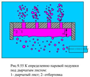 Режим работы дырчатого листа зависит от расхода паровой фазы и диаметра паровых пузырьков и отверстия в листе (рис.9.54). При небольших расходах пара и малом диаметре (dП < d1) пузырьки свободно проходят через отверстия в виде отдельных пузырьков, не сливаясь (рис.9.54а). Если dП > d1, то паровой пузырек втягивается в отверстие, разделяясь на две части (рис.9.54б). На часть пузырька, находящуюся над листом, действуют подъемная сила и конвективные токи, стремящиеся оторвать ее от листа.