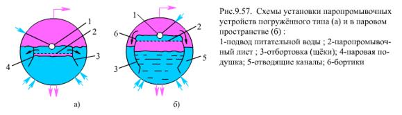 В современных барабанах устанавливаются системы гашения кинетической энергии струй воды и пароводяной смеси, поступающих в барабан, и равномерной раздачи по сечению барабана. В этих условиях определяющим генератором капель воды в паровой объем является разрыв пузырей пара (рис.9.58).