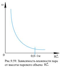 Таким образом, влажность пара определяется забросом капель воды в пароотводящие трубы и уносом капель потоком пара. При малых высотах парового пространства основную роль играет прямой заброс водяных капель, а при больших высотах - унос влаги. Поэтому ω сильно зависит от высоты парового пространства (рис.9.59), особенно до высоты 0,8…1 м.