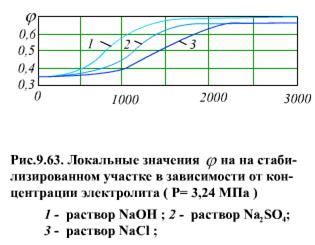 Упрочнение жидкой пленки, повышение s приводит к тому,что при выходе из погруженного дырчатого листа образуются мелкие пузырьки пара, количество их возрастает. Все это приводит к изменению (увеличению) паросодержания φБАРБ на стабилизированном участке двухфазного слоя (рис.9.63). При низких концентрациях электролитов в котловой воде СК.В, мг/кг, паросодержание φБАРБ не изменяется по сравнению с чистой водой: при концентрации выше критического значения СКР начинается набухание двухфазного слоя, φБАРБ увеличивается. При дальнейшем повышении концентрации СК.В, значения φ стабилизируются на новом, более высоком значении (примерно в 2 раза выше).