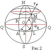(геоцентрическая широта) – угол между экватором и радиусом проведенным из центра эллипсоида через точку М .