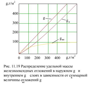 Соотношение удельных количеств отложений в наружном gн и внутреннем gвн слоях зависит от их общего количества g (рис. 11.19). Линейный характер этой зависимости говорит о том, что продолжительность формирования отложений не влияет на закономерность распределения примеси между слоями.