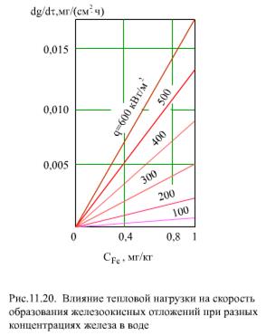 Скорость образования отложения А,мг/(см2Чч), зависит линейно от концентрации СFe, мг/кг, и от теплового потока q, Вт/м2, во второй степени