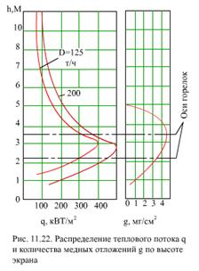 3.Отложения соединений меди. Оксиды меди в питательной воде появляются в результате коррозии латунных труб конденсатора, ПНД или деталей насоса, содержащих медь. При концентрации меди 2 мкг/кг происходит интенсивное отложение меди на участках с высокими тепловыми потоками или в местах глубокого упаривания воды (рис. 11.22). В отложениях присутствует главным образом чистая медь. Восстановление ионов меди до чистой меди присходит при контакте их с чистым железом. Процесс этот электрохимический, для его осуществления необходима достаточно высокая разность потенциалов. Поэтому медные отложения образуются в заметных количествах в зоне тепловых потоков выше порогового значения q0 (рис. 11.23). Скорость образования отложений меди описывается формулами