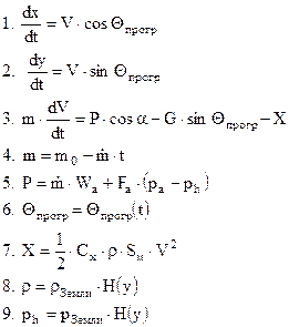 Таким образом необходимо определить параметры движения ракеты на активном участке . Для этого составим систему уравнений :