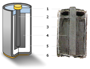 Марганцево-цинковый элемент, также известный как элемент Лекланше — это первичный химический источник тока, в котором анодом является цинковый стаканчик (корпус батарейки) с герметичным уплотнением из полимерных материалов. Катодом – графитовый стержень, помещенный в смесь диоксида марганца с измельченным графитом. В качестве электролита (ионного проводника) используется пастообразная смесь хлоридов аммония и цинка. Это один из самых широко распространенных ГЭ (DЕ = 1,25-1,5В). Используется в переносных устройствах для питания радиоприемников, часов, игрушек и пр. Он очень удобен в эксплуатации, т.к. его составные части твердые или пастообразные. Изначально элементы заполнялись жидким электролитом. В дальнейшем электролит стали загущать с помощью крахмалистых веществ — это позволяло сделать более практичные элементы питания, называемые сухими, в которых сведена к минимуму возможность вытекания электролита.