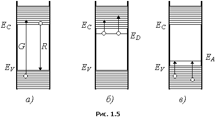 С точки зрения зонной теории под генерацией свободных носителей заряда следует понимать переход электронов из валентной зоны в зону проводимости (рис. 1.5,а). В результате таких переходов в валентной зоне появляются свободные энергетические уровни, отсутствие электронов на которых следует трактовать как наличие на них фиктивных зарядов - дырок. Переход электронов из зоны проводимости в валентную зону следует трактовать как рекомбинацию подвижных носителей заряда. Чем шире запрещенная зона, тем меньше электронов способно преодолеть ее. Этим объясняется более высокая концентрация электронов и дырок в германии по сравнению с кремнием.