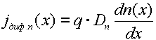 Ток диффузии возникает в результате неравномерного распределения концентрации носителей заряда. Плотность тока диффузии определяется количеством диффундирующих частиц в единицу времени через единичную площадку, перпендикулярную направлению диффузии (формулы 1.26 и1.27). Умножая плотность потока на отрицательный заряд электрона или положительный заряд дырки получаем соотношения для диффузионных токов электронов и дырок: