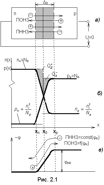 Распределение концентрации электронов вдоль оси x показано на рис. 2.1,б. Так как концентрация электронов в n-полупроводнике nn (основные носители заряда) значительно превышает концентрацию электронов в p-полупроводнике np (неосновные носители заряда), то в плоскости контакта возникает диффузия электронов из n-области в p-область. Аналогичные рассуждения приводят к диффузии дырок из p-области в n-область. Таким образом через p-n-переход протекают диффузионные потоки основных носителей заряда (ПОНЗ).