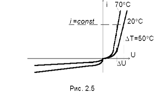Вольтамперные характеристики p-n-перехода для двух значений температуры окружающей среды приведены на рис. 2.6. С ростом температуры падает прямое напряжение на p-n-переходе при заданном токе и растет обратный ток при заданном напряжении.