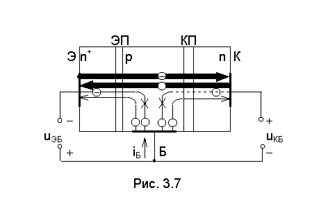 В режиме насыщения оба перехода транзистора находятся в открытом состоянии. На рис. 3.7 приведена структура транзистора и показаны потоки носителей, протекающие в режиме насыщения. Как видно из рисунка, в этом режиме и эмиттер, и коллектор инжектируют электроны в базу, в результате чего в структуре протекают два встречных сквозных потока электронов (нормальный и инверсный). От соотношения этих потоков зависит направление токов, протекающих в цепях эмиттера и коллектора. Вследствие двойной инжекции база транзистора очень сильно насыщается избыточными электронами, из-за чего усиливается их рекомбинация с дырками, и рекомбинационный ток базы оказывается значительно выше, чем в активном или инверсном режимах.
