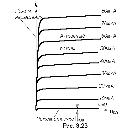 Особенностью выходной характеристики транзистора в схеме с общим эмиттером по сравнению с характеристикой в схеме с общей базой, является то, что она целиком лежит в первом квадранте. Это связано с тем, что в схеме ОЭ напряжение uКЭ распределяется между обоими переходами, и при uКЭ< uБЭ напряжение на коллекторном переходе меняет знак и становится прямым, в результате транзистор переходит в режим насыщения при uКЭ >0 (cм. рис. 3.23). В режиме насыщения характеристики сливаются в одну линию, то есть ток коллектора не зависит от тока базы. Так же, как и в схеме ОБ, идеализированная характеристика в активном режиме не зависит от напряжения uКЭ. Реально имеет место заметный рост тока iК с ростом uКЭ (см. рис. 3.23), связанный с эффектом Эрли. Этот рост выражен значительно сильнее, чем в схеме ОБ в связи с более резкой зависимостью от напряжения на коллекторном переходе коэффициента передачи тока базы b по сравнению с коэффицентом передачи тока эмиттера a . Также более резкой зависимостью b от тока эмиттера и, соответственно, от тока базы объясняется практическое отсутствие эквидистантности характеристик. При iБ=0 в цепи коллектора протекает ток iКЭ0= b iБЭ0. Увеличение тока в b раз по сравнению со схемой ОБ объясняется тем, что в схеме ОЭ при iБ=0 и uКЭ >0 эмиттерный переход оказывается несколько приоткрыт напряжением uКЭ, и инжектируемые в базу электроны существенно увеличивают ток коллектора.