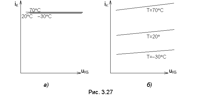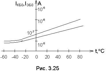 Увеличение тепловых токов переходов с ростом температуры, подробно рассмотренное в разделе 2, описывается приводимыми в справочниках температурными зависимостями токов IКБ0, IЭБ0. Типовые зависимости токов IКБ0 и IЭБ0 от температуры для кремниевого маломощного транзистора приведены на рис. 3.25.