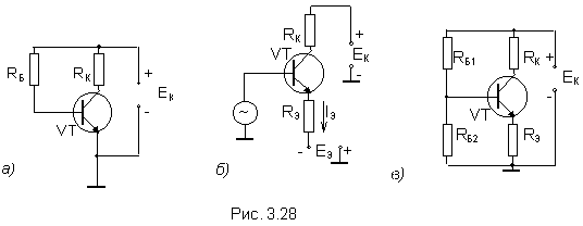 Таким образом, в этой схеме обеспечивается высокая температурная стабильность (как в схеме ОБ), правда достигается она за счет использования дополнительного источника питания. Следует заметить, что указанная схема представляет собой по переменному току - схему ОЭ, а по постоянному току - схему ОБ. Третья схема (см. рис. 3.28,в) занимает промежуточное по термостабильности положение между двумя первыми схемами. В этой схеме фиксируется напряжение uБЭ и при рациональном выборе RБ1,RБ2 и RЭ температурная стабильность всего в 2 - 3 раза хуже, чем во второй схеме.