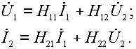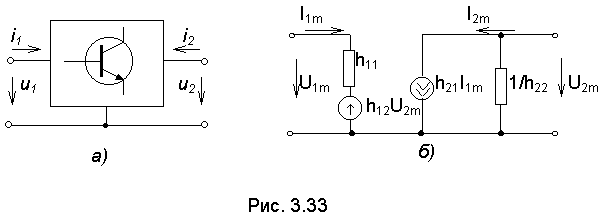 Уравнениям (3.48) соответствует эквивалентная схема (рис. 3.33,б). Из (3.48) вытекают смысл и наименование h-параметров: