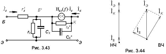 Таким образом частотная зависимость H21Э аналогична зависимости H21Б, но предельная частота в десятки и более раз ниже (примерно в h21Э раз). Физически эта закономерность объясняется с помощью векторной диаграммы токов транзистора (рис.3.44), из которой видно, что небольшой сдвиг фаз между близкими токами