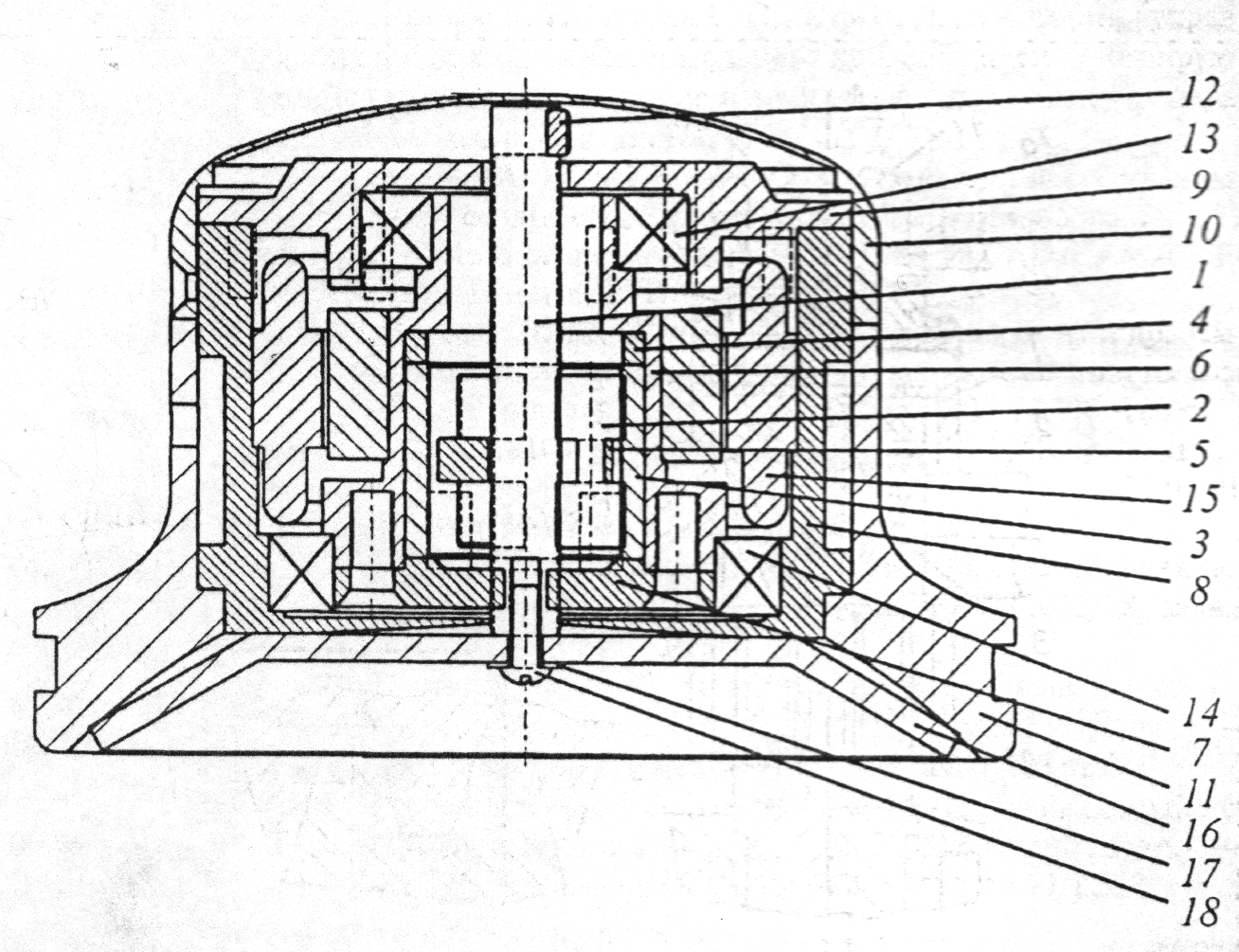 Рис. 5.19. Схема привода ИСВК на базе роликовинтового механизма: 1 – винт; 2 – ролики; 3 – гайка; 4 – втулка; 5 – сепаратор; 6 – стакан; 7,9 – крышка; 8 – корпус; 10,11 – корпусные детали; 12 – магнит; 13,14 – подшипники; 15 – электродвигатель; 16 – мембрана; 17 – шайба; 18 – винт.