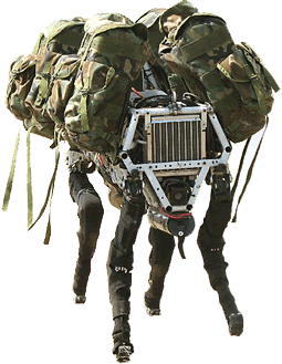 Робот обладает достаточнобыстрой реакцией на внешние неблагоприятные воздействия (на испытаниях, например, робот быстро переставлял свои конечности и сохранял устойчивость, даже когда испытатели сильно толкали его ногой в бок [46]). Такие качества роботу обеспечили многочисленные датчики равновесия, ориентации на местности, положения отдельных звеньев конечностей, тактильные датчики и др., а также мощная компьютерная система управления с элементами искусственного интеллекта. Такие роботы могут бегать за солдатами, красться, использоваться для транспортировки грузов (вооружать такой робот не предполагается). С целью повышения автономности робота в качестве привода используется бензиновый двигатель.